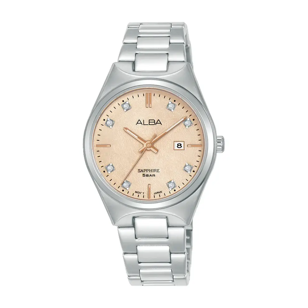 The stainless steel construction adds durability. And, like other sapphire models from Alba, it features scratch-resistant sapphire glass, helping preserve the clarity and brilliance of the dial.